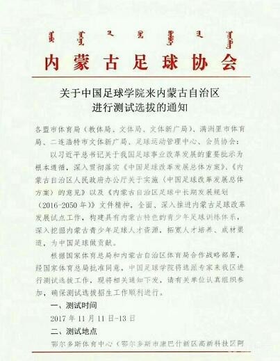 中国足球学院在内蒙古招生,U18要求身高185以上