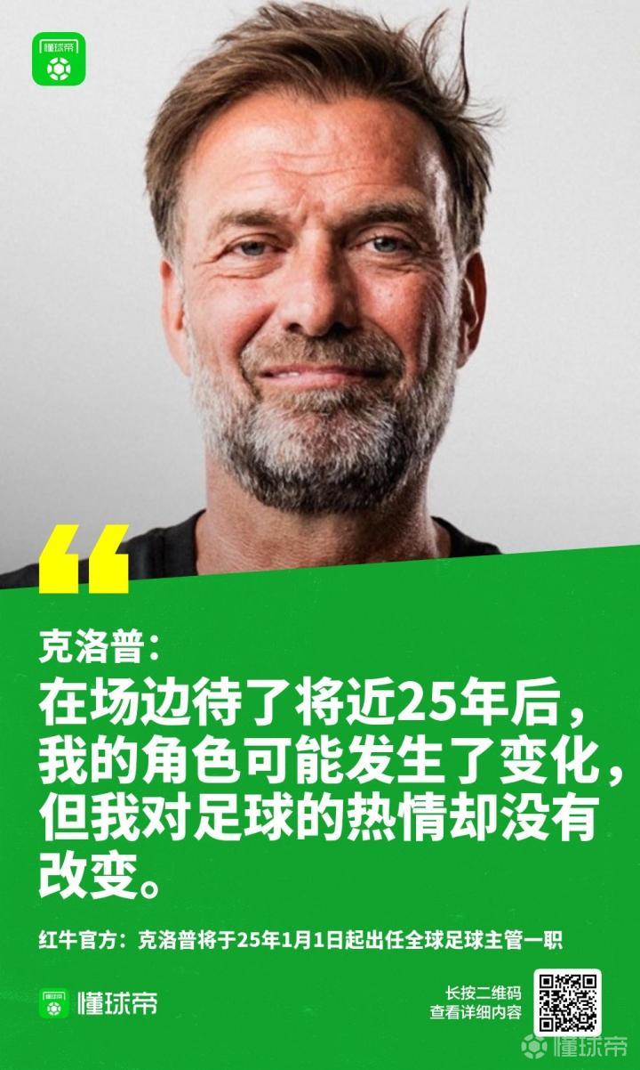 “尤尔根-克洛普将于2025年1月1日开始担任红牛全球足球主管的新职务,这是他在执掌英超豪门利物浦取得巨大成功后的首次任命。在他的新职位上,这位魅力非凡的德国人将监管红牛的国际足球俱乐部网络。他不会参与俱乐部的日常运营,但会提供战略愿景,支持各个体育主管推进“红牛理念”。此外,57岁的他将支持红牛集团的全球球探业务,并为教练的培训和发展做出贡献。克洛普的教练生涯始于2001年的美因茨,他对以战略角色接管多俱乐部项目的前景感到兴奋。”