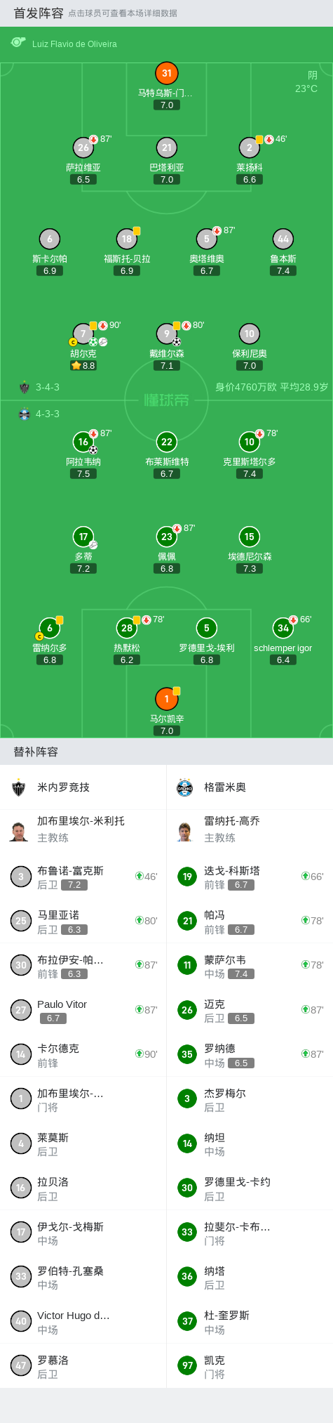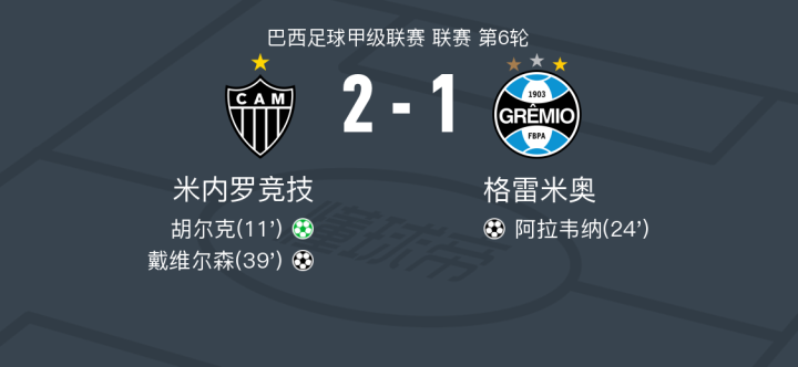 米内罗竞技2-1格雷米奥,戴维尔森建功,胡尔克点射破门