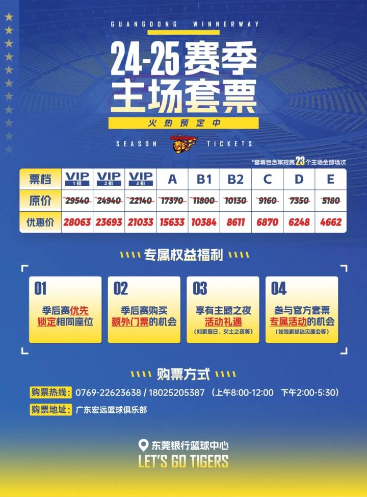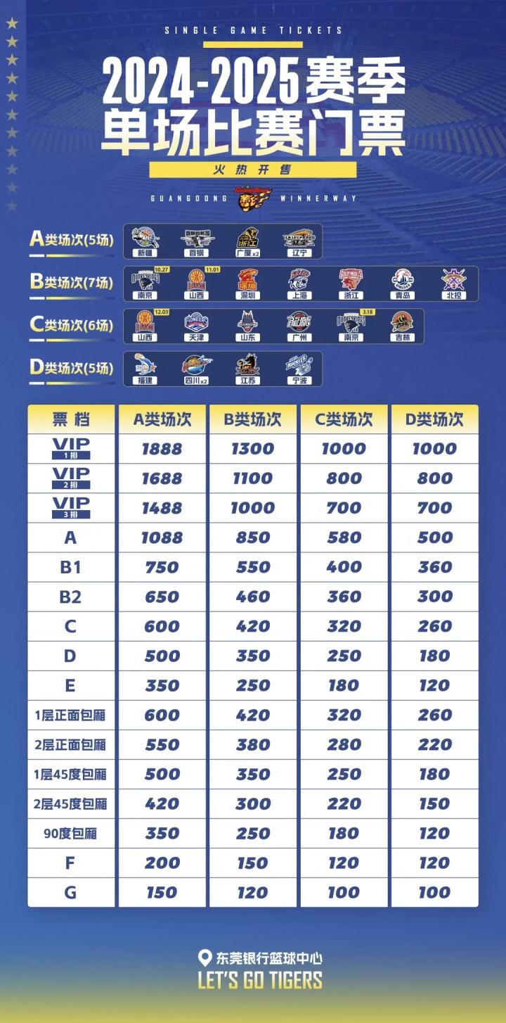 广东男篮新赛季常规赛票价:单次票最低100元&套票最低4662元