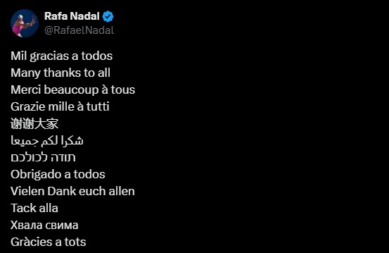 值得一提的是,在宣布退役的这条社媒内容里,纳达尔用12种语言写了“谢谢大家”,其中就包括汉语。