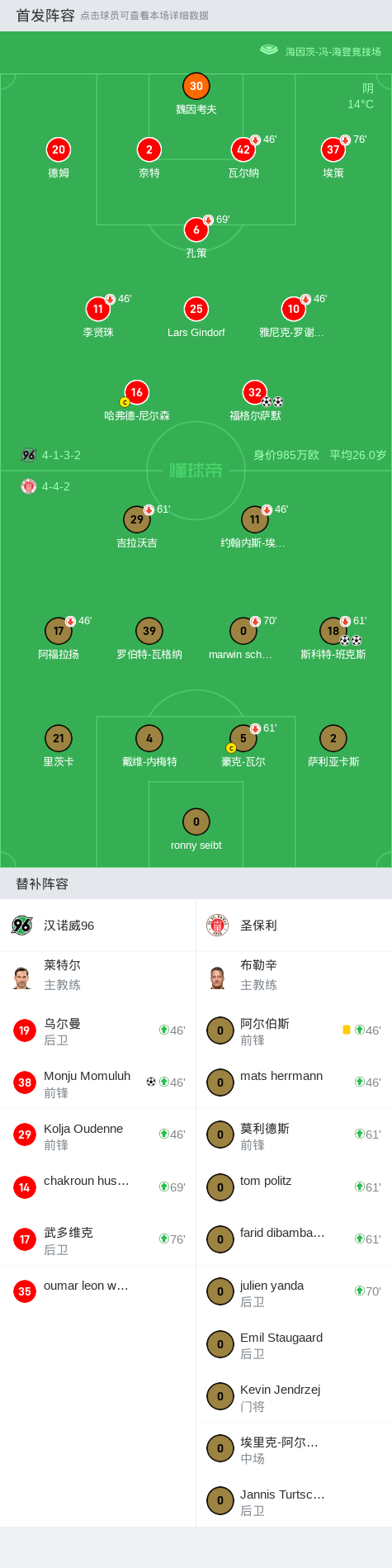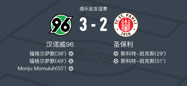 汉诺威96 3-2逆转圣保利,福格尔萨默双响,Monju Momuluh破门