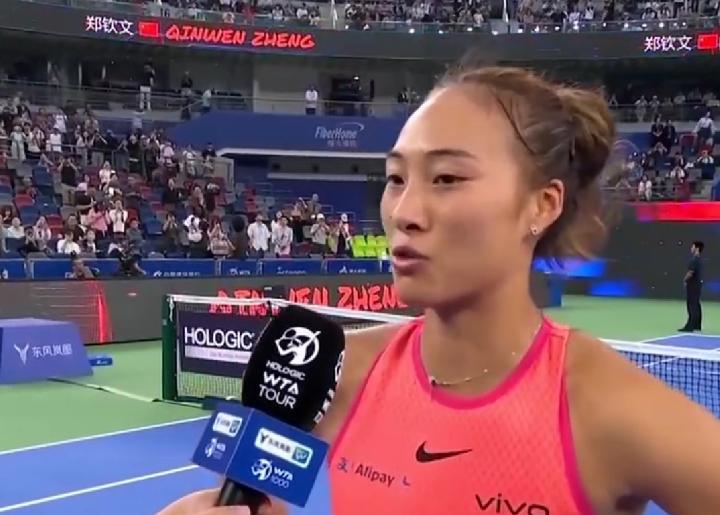 郑钦文:“我觉得跟她对战很不容易,因为我觉得她的网球(打法)跟其他人的不太一样,因为她是完全站在底线进攻的。然后今天也是我第一次赢她,我还是觉得很开心,当然我觉得这场胜利离不开观众的支持,是你们把我带动了起来,谢谢为我加油的大家。”
