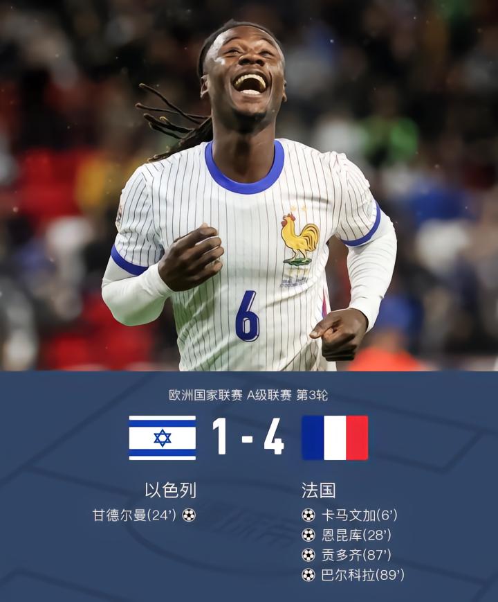 北京时间10月11日2:45,欧国联A级联赛第3轮,法国对阵以色列。上半场,卡马文加远射破门,奥斯曼-登贝莱抽射打偏,恩昆库小角度低射建功,迈克尔-奥利塞远射打偏。下半场,奥斯曼-登贝莱远射被门将没收,楚阿梅尼推射被挡出底线,特奥助攻贡多齐推射建功,随后贡多齐助攻巴尔科拉推射破门,最终,法国4-1战胜以色列。