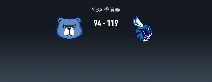 第四节灰熊贝恩拿下9分,黄蜂提贾尼-萨隆拿下10分,最终灰熊94-119不敌黄蜂
