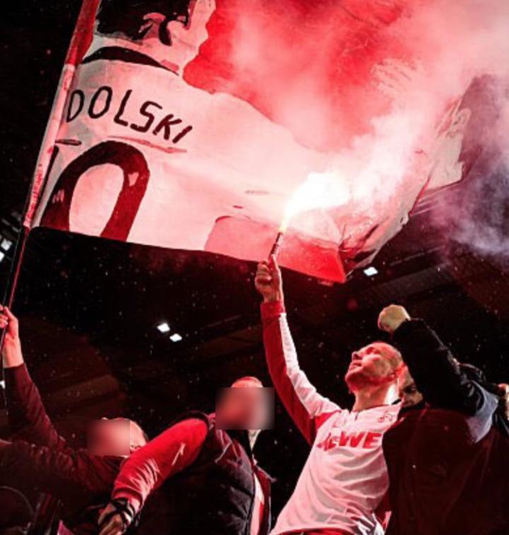 最后时刻波多尔斯基走到了一直陪伴他的科隆球迷群众中,并与他们一起高举焰火。