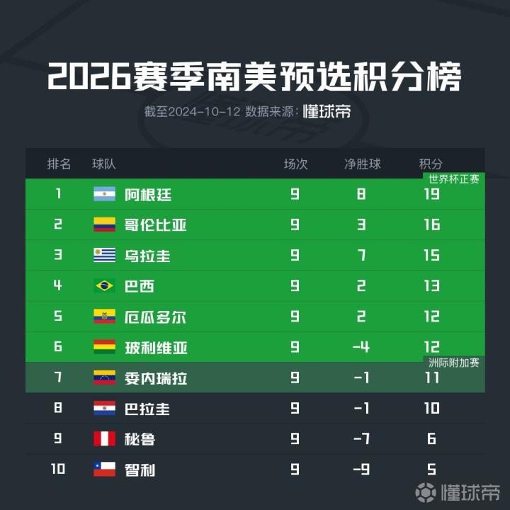 北京时间10月12日,南美世预赛第9轮比赛全部结束,目前阿根廷19分领跑,哥伦比亚第二,乌拉圭第三,巴西第四。