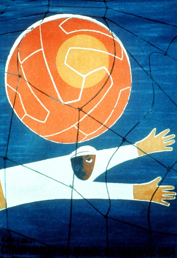 这次的海报有别于往届具体的绘画风格,就像是一副以蓝、橙、白为主色调的印象画作。守门员回头目送皮球入网的表情颇为有趣,巧合的是,这的确是一届大打攻势足球的世界杯。