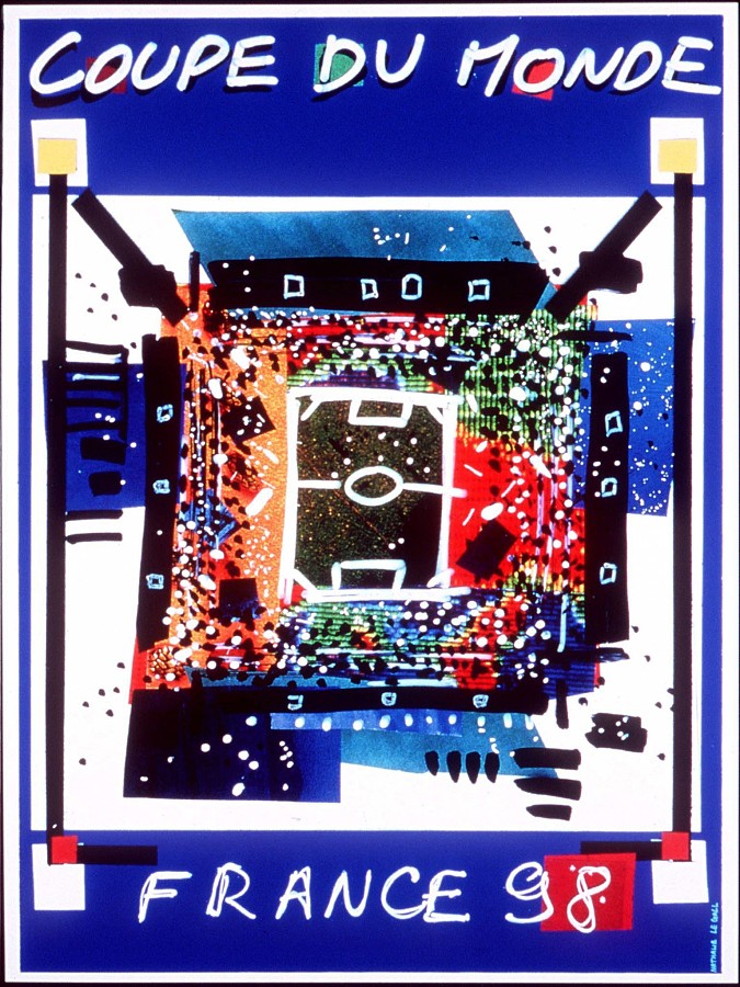 而这张以蓝色为底的海报则充分体现了法国人的浪漫。他们不仅在色彩上延续上届斑斓的用色风格,俯瞰足球场的图案也稍微有些类似1990年意大利之夏的那张。
