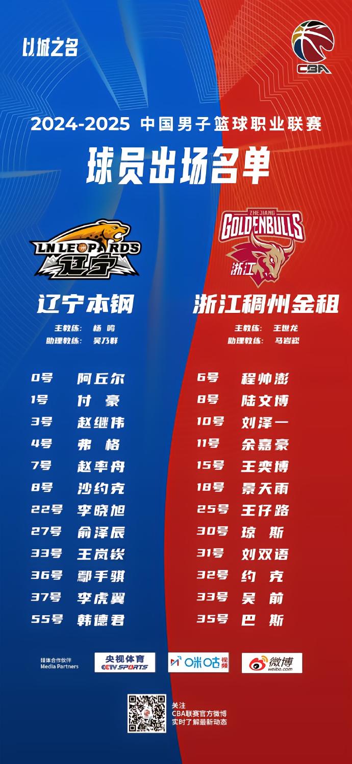 CBA揭幕战辽宁vs浙江出场名单:均3外援出战,张镇麟伤缺绿鱼绿 @懂球帝2024-10-12 19:04北京时间10月12日晚,新赛季CBA揭幕战,辽宁男篮主场迎战浙江男篮。赛前两队出场名单公布,双方均三外援出战,辽宁队新援王岚嵚在列。张镇麟因伤未参加赛季前的体测,将会缺席常规赛前五轮比赛。展开更多