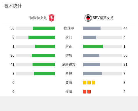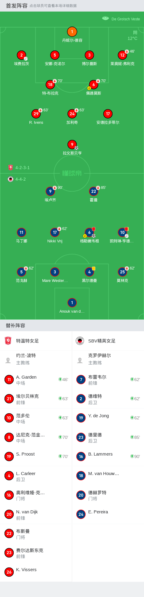 在荷兰女子足球甲级联赛的第三轮比赛中,特温特女足坐镇主场迎战SBV精英女足。比赛中,SBV精英女足的凯特琳-亨德里克斯为格勒嫩韦根送出精妙助攻,帮助球队率先取得进球。随后,特温特女足的埃费拉茨也不甘示弱,助攻拉文斯贝亨扳平比分。比赛中,格勒嫩韦根因犯规被罚下场,随后凯特琳-亨德里克斯也因累计黄牌被罚出场。最终,双方以1-1握手言和。