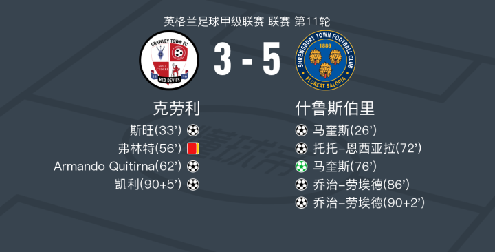 什鲁斯伯里5-3克劳利,马奎斯双响,乔治-劳埃德双响