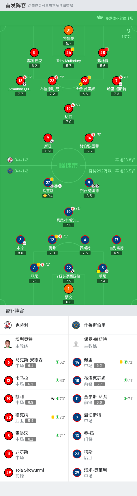 第72分钟,什鲁斯伯里球员本宁助攻托托-恩西亚拉打入一球。