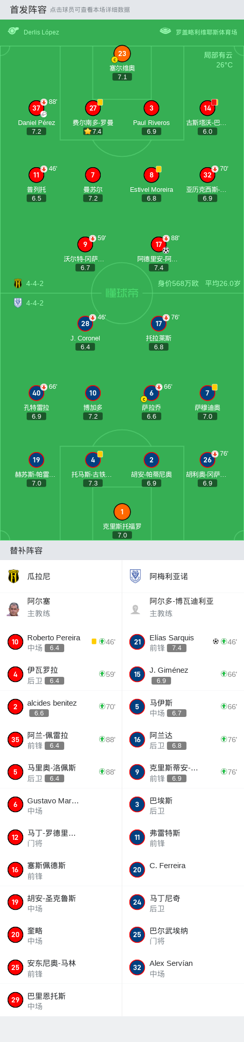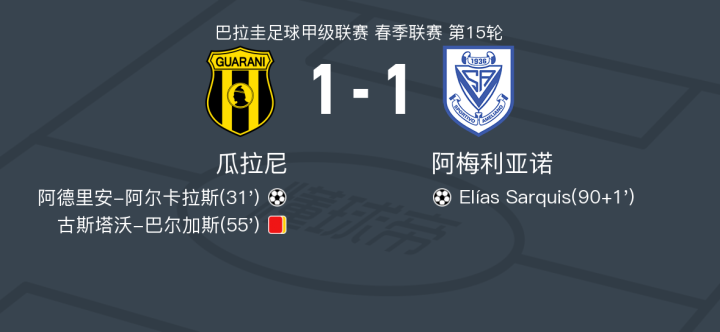 在巴拉圭足球甲级联赛春季联赛第15轮的比赛中,瓜拉尼坐镇主场迎战阿梅利亚诺。比赛中,瓜拉尼的阿德里安-阿尔卡拉斯在队友Daniel Pérez的助攻下成功破门,为球队取得领先。然而,比赛中途,瓜拉尼的古斯塔沃-巴尔加斯因累计两张黄牌被罚下场,给球队带来了不小的压力。比赛接近尾声时,阿梅利亚诺的Elías Sarquis抓住机会,为球队扳平比分。最终,双方以1-1握手言和。