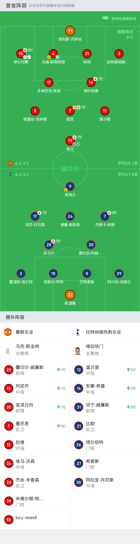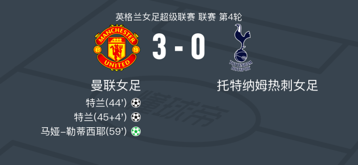 在英格兰女足超级联赛第4轮的比赛中,曼联女足坐镇主场迎战托特纳姆热刺女足。比赛中,曼联女足的特兰表现出色,成功打入两球,展现了强大的进攻能力。此外,马娅-勒蒂西耶也通过点球为球队再添一分。最终,曼联女足以3比0的比分战胜对手,取得了一场令人振奋的胜利。