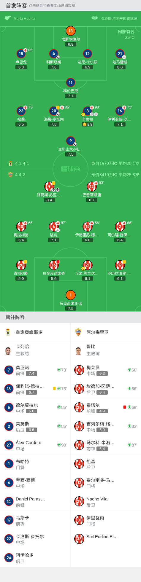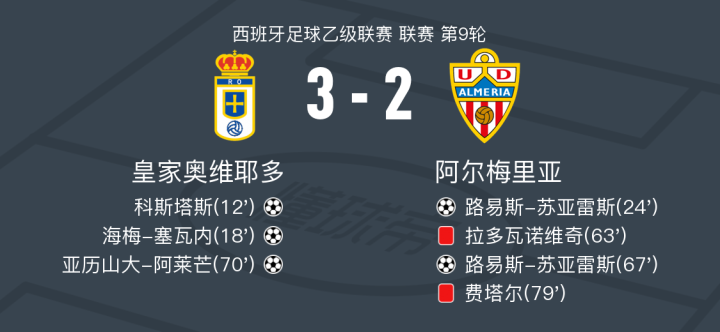 皇家奥维耶多3-2阿尔梅里亚,亚历山大-阿莱芒、海梅-塞瓦内建功