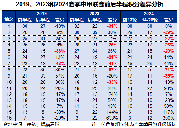 统计2019、2023和2024三个赛制完整的年份,上半程排名前十、下半程积分下滑超过两成的中甲球队数量占比分别为20%、60%和60%,把范围缩小到上半程前五的话,下半程大滑坡的中甲球队数量占比分别为20%、40%、80%。