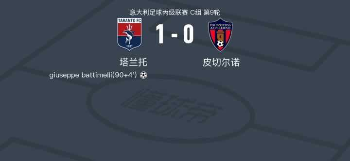 下半场补时第4分钟,塔兰托球员giuseppe battimelli打入一球。