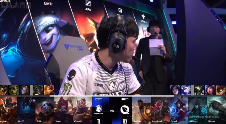第3分钟,TL下路二打一击杀Bwipo,CoreJJ拿下一血,0-1(FLY在前)。