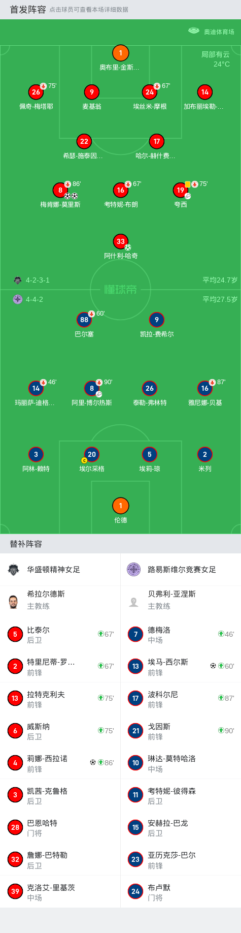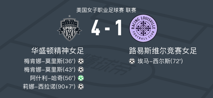 华盛顿精神女足4-1大胜路易斯维尔竞赛女足,梅肯娜-莫里斯两球,阿什利-哈奇点射破门