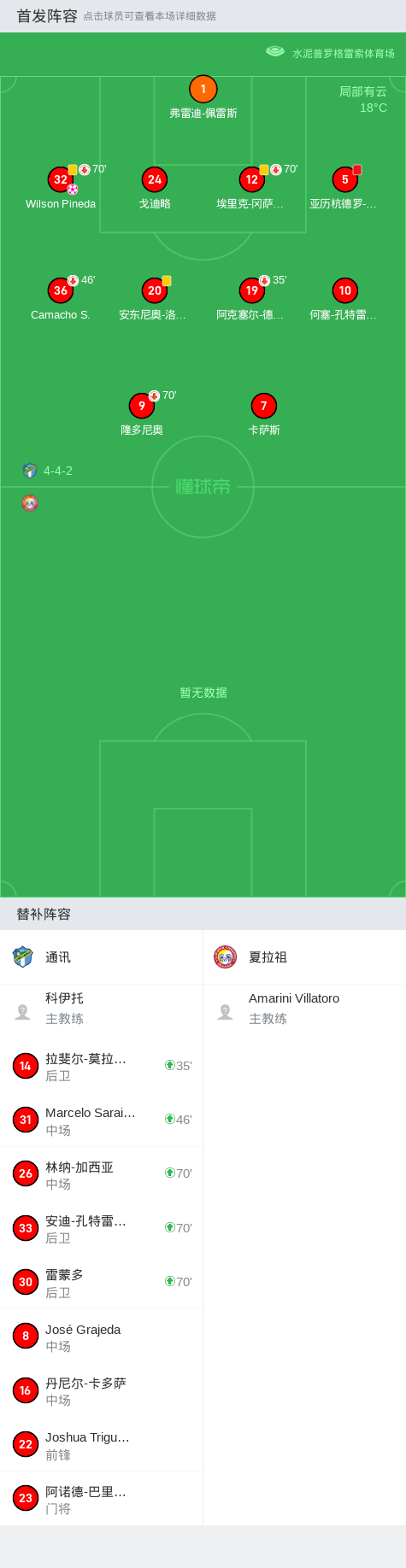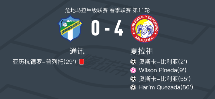 在危地马拉甲级联赛春季联赛第11轮的比赛中,通讯队坐镇主场迎战夏拉祖队。比赛中,夏拉祖的奥斯卡-比利亚表现出色,成功打入两球,展现了强大的进攻能力。此外,Harim Quezada也为夏拉祖贡献了一粒进球,进一步扩大了比分差距。通讯队则在比赛中出现失误,Wilson Pineda不慎自摆乌龙,给对手送上了一份大礼。最终,夏拉祖以4比0的比分大胜通讯,取得了一场酣畅淋漓的胜利。