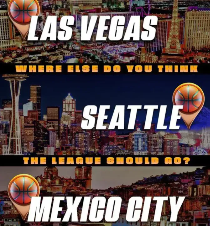 墨西哥城已经有一支NBA发展联盟球队,叫“墨西哥城队长”。西雅图和拉斯维加斯的呼声都很高。除了西雅图超音速队可能“复活”,拉斯维加斯大概率要有一支球队,那里很受NBA的欢迎。