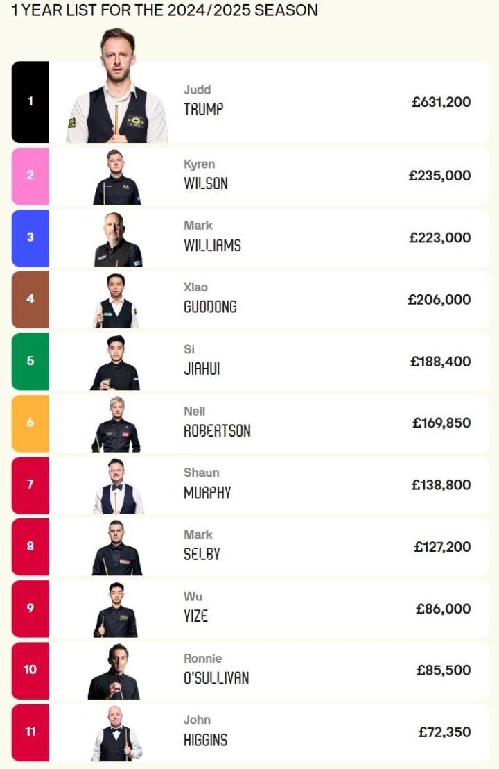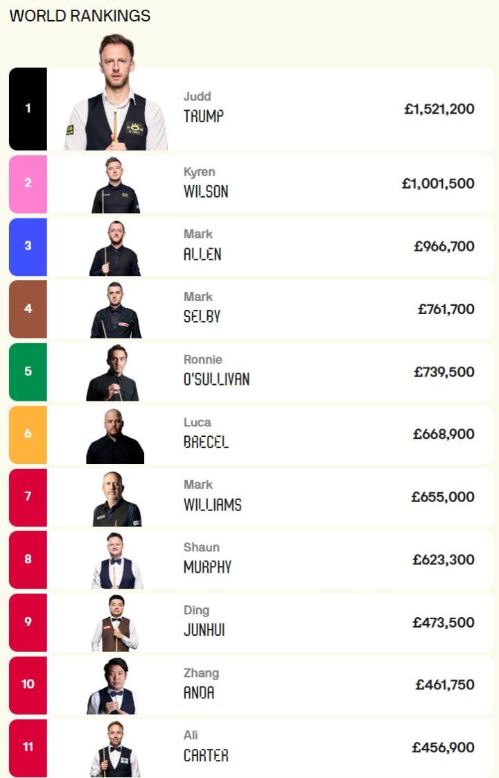 其他中国选手方面,肖国栋排在第4位,斯佳辉排在第5位,吴宜泽排在第9位,张安达排在15位,庞俊旭排在17位。