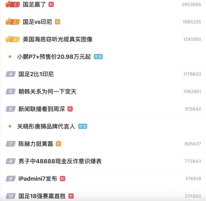 赢了!国足占据热搜前二,前10有4个相关rigeman2024-10-15 22:2910月15日,中国男足在主场2-1击败了印度尼西亚,赛后,国足相关话题冲上热搜,占据高位。截止到22点25分,中国男足相关的话题#国足赢了 #国足vs印尼 排名在微博热搜榜的前两位,热度是遥遥领先。#国足2比1印尼 的话题则是排名第四,#国足18强赛赢首胜 则是排名第十。此外,#国足印尼冲突 #伊万换人 等话题也在热搜榜单上。展开更多