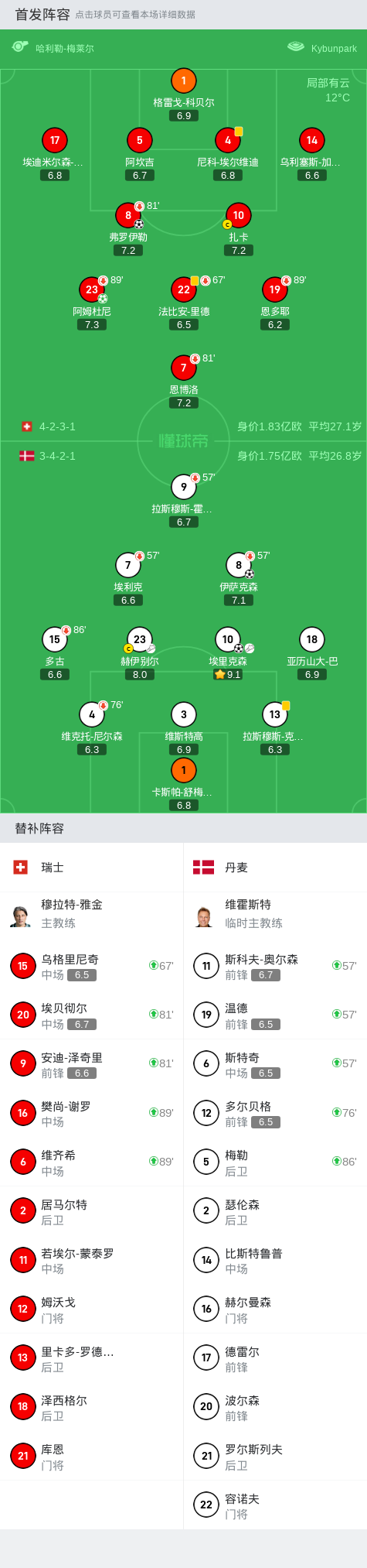 瑞士2-2丹麦,埃里克森传射,弗罗伊勒、阿姆杜尼破门