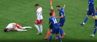 第77分钟,危险动作,利瓦科维奇没收住放倒莱万,裁判出示直红