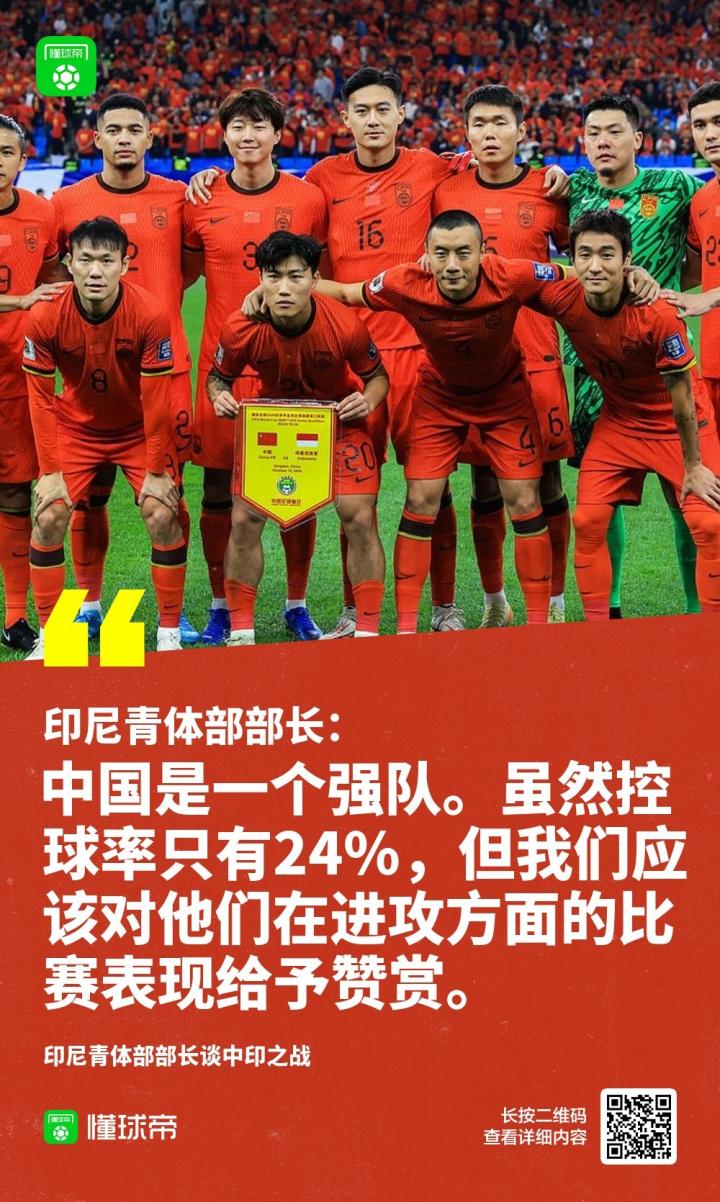 印度尼西亚青年与体育部部长Dito Ariotedjo表示:“比赛中我们在进攻上也表现得很好,要知道,刚才我们的控球率如果没记错的话是为76%,而中国队只有24%。因此,我们应该对他们在进攻方面的比赛表现给予赞赏。”