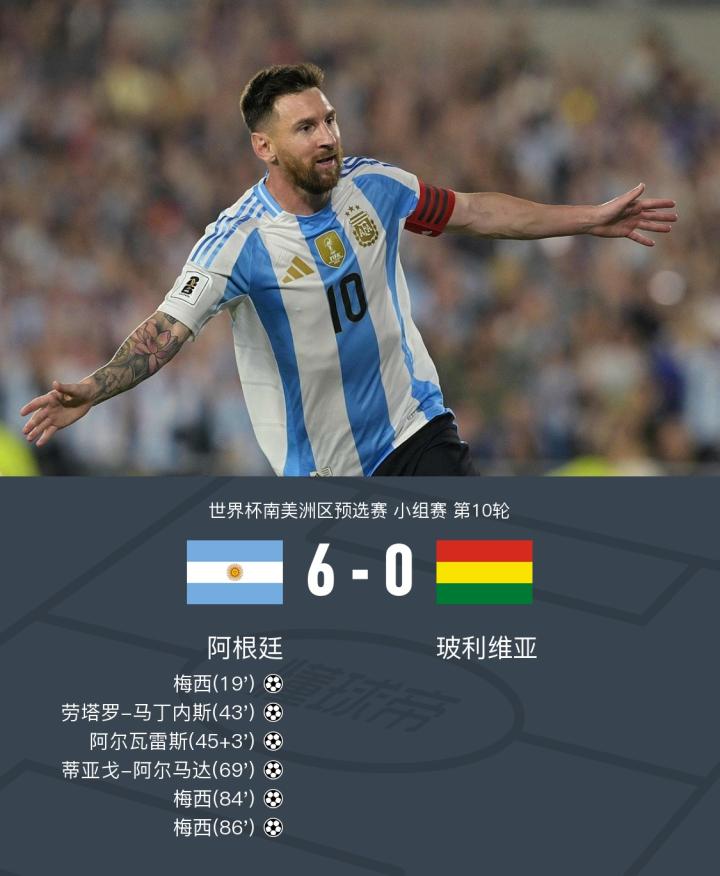 世预赛:阿根廷6-0玻利维亚,梅西戴帽+两助攻,劳塔罗破门