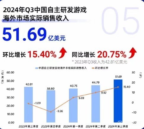 中国自主研发游戏海外市场实际销售收入51.69亿美元,环比增长15.40%,同比增长20.75%,其主要来源是《黑神话:悟空》在海外市场的突出表现。