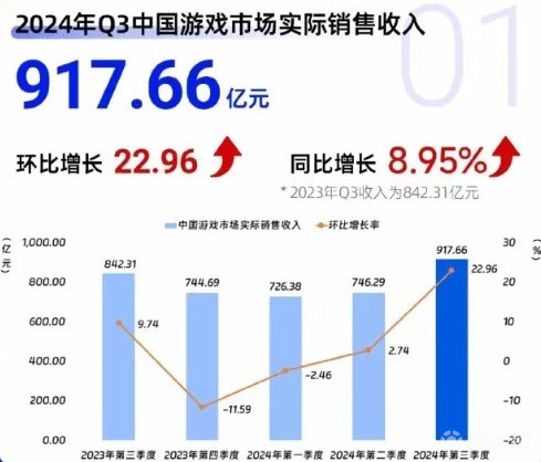 数据显示,2024年第三季度中国游戏市场收入917.66亿元,环比增长22.96%,同比增长8.95%。中国音数协指出,本季度移动游戏新品和头部产品带来较大收入增幅,同时《黑神话:悟空》也给单机和主机市场带来较大增量,中国游戏市场收入创历史新高。