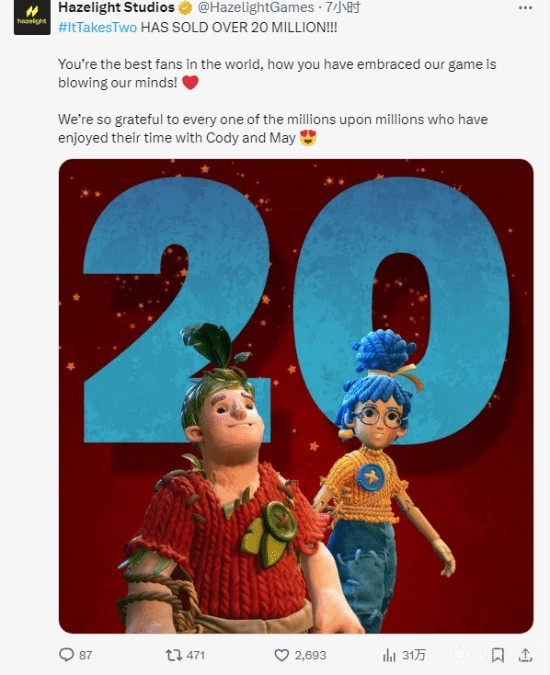 官方致谢,《双人成行》累计销量破2千万份