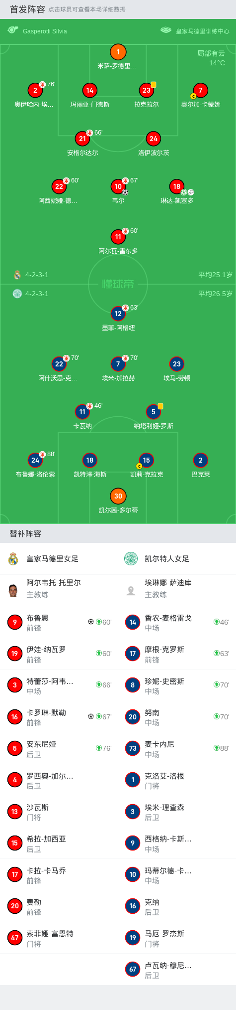 第72分钟,皇家马德里女足球员伊娃-纳瓦罗助攻布鲁恩打入一球。