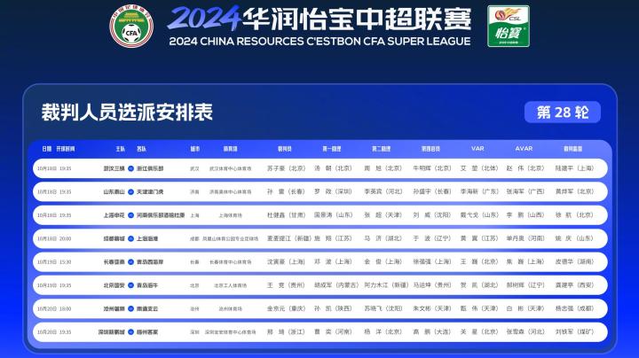 10月18日-20日,2024赛季中超展开第28轮即倒数第3轮角逐。赛前,中国足协公布了本轮裁判人员选派安排表。