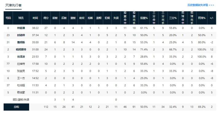 天津先行者林庭谦27分4板3助1断1帽,哈姆雷特24分3板3助,大卫-詹姆斯21分14板4助4断。