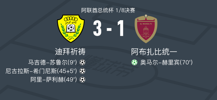 迪拜祈祷3-1阿布扎比统一,阿里-萨利赫、尼古拉斯-希门尼斯建功