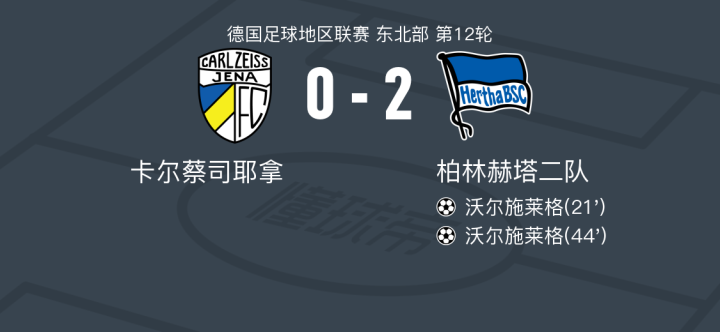 柏林赫塔青年队2-0卡尔蔡司耶拿取德地区3连胜,沃尔施莱格独中两元