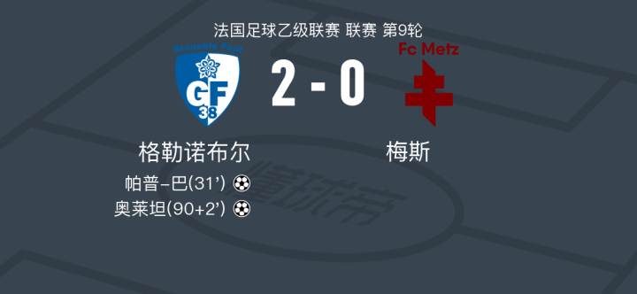 格勒诺布尔2-0梅斯,帕普-巴破门,奥莱坦锁定胜局
