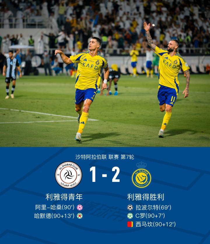 在沙特阿拉伯联赛第七轮的较量中,利雅得青年坐镇主场迎战利雅得胜利。上半场,两队均无建树。下半场,拉波尔特打破僵局。萨迪传中,阿里-哈桑自摆乌龙。补时阶段,加里卜造点,C罗主罚命中。读秒阶段,西马坎送点并吃到第二张黄牌被罚下,不过哈默德主罚的点球击中立柱弹出,利雅得青年错失绝平。全场比赛结束,利雅得胜利客场2-1战胜利雅得青年,取得各项赛事6连胜。