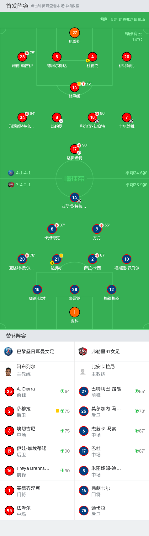 在法国女子甲组联赛第5轮的比赛中,巴黎圣日耳曼女足坐镇主场迎战弗勒里91女足。比赛中,巴黎圣日耳曼的洛伊希特送出精妙助攻,科尔宾-艾伯特成功破门,为球队首开纪录。随后,弗勒里91的艾莎塔-特拉奥雷凭借个人能力扳平比分。比赛接近尾声时,巴黎圣日耳曼的热约罗再次送出助攻,卡尔沙维抓住机会打入制胜一球。最终,巴黎圣日耳曼女足以2-1战胜弗勒里91女足,取得胜利。