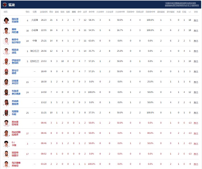多伦多猛龙斯科蒂-巴恩斯21分6板3助2断1帽,阿巴吉16分6板2助1断,珀尔特尔14分8板4助1断2帽。