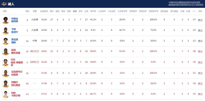 洛杉矶湖人昆西-奥利瓦里22分6板2助,布朗尼-詹姆斯17分4板1助3断1帽,海耶斯7分7板2助。