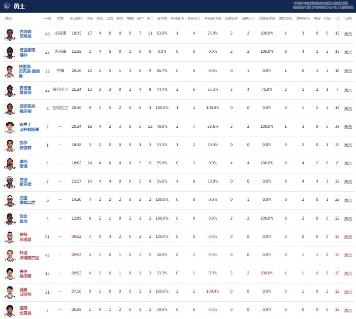 金州勇士库明加17分4板,波杰姆斯基16分4板2助3断,希尔德14分4板4助;