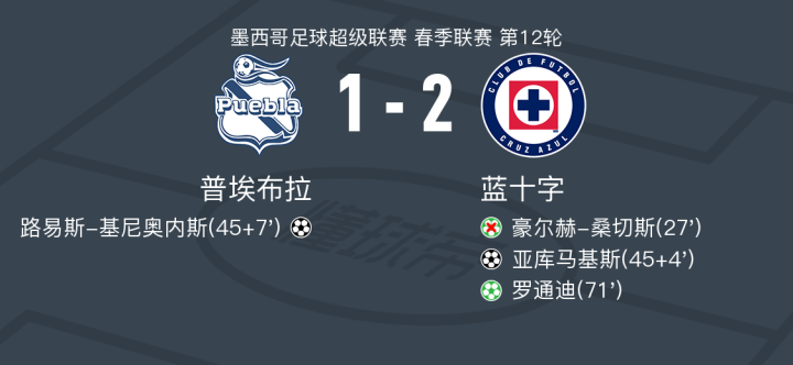 蓝十字2-1普埃布拉取墨超4连胜,罗通迪点射,亚库马基斯破门