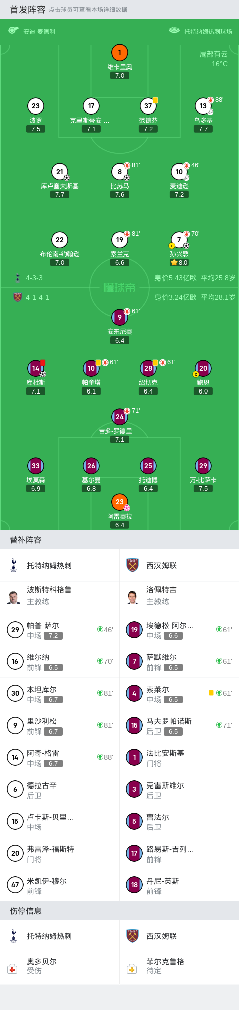 剑南春|热刺4-1西汉姆联,孙兴慜破门+造乌龙,库杜斯染红
