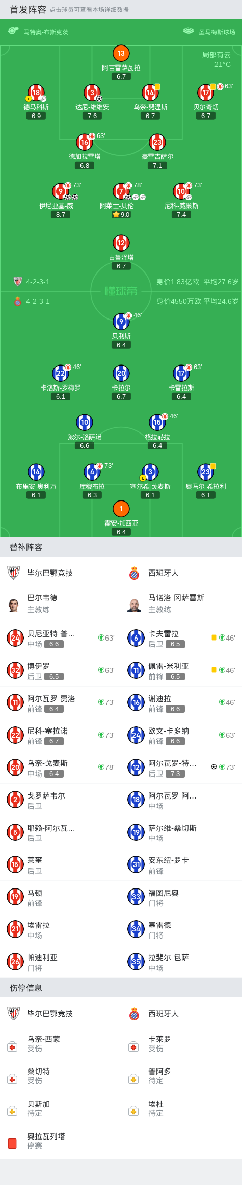 第30分钟,毕尔巴鄂竞技球员阿莱士-贝伦格尔助攻伊尼亚基-威廉斯打入一球。