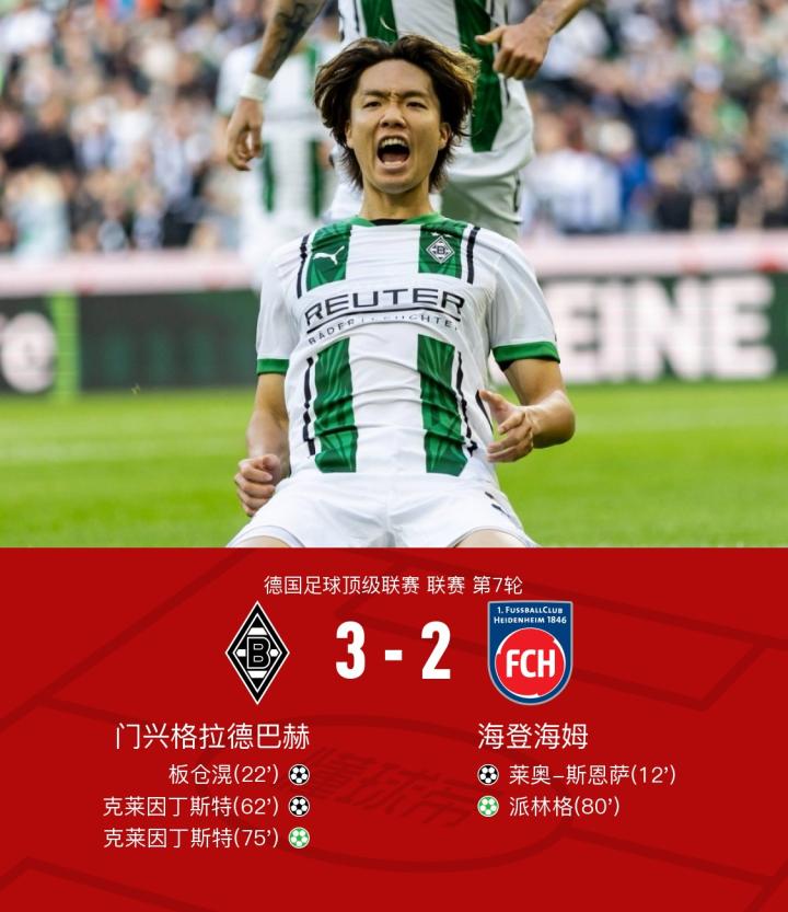 在德国足球顶级联赛第7轮的较量中,门兴格拉德巴赫坐镇主场迎战海登海姆。比赛中,海登海姆的莱奥-斯恩萨率先为球队取得进球。随后,门兴格拉德巴赫的板仓滉迅速扳平比分。下半场,普莱亚为克莱因丁斯特送出助攻,帮助门兴格拉德巴赫反超比分。克莱因丁斯特随后通过点球再下一城,完成个人本场比赛的第二个进球。海登海姆的派林格也通过点球为球队缩小差距。最终,门兴格拉德巴赫以3-2战胜海登海姆,取得胜利。